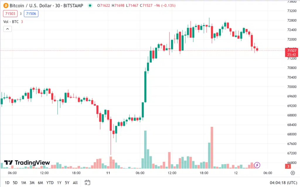 อย่างไรก็ตาม โดยในขณะที่เขียนข่าวนี้ราคาของ Bitcoin อยู่ที่ 71,527 ดอลลาร์ และอย่าลืมว่า การลงทุนมีความเสี่ยงสูง นักลงทุนควรศึกษาข้อมูลและประเมินความเสี่ยงก่อนตัดสินใจลงทุน