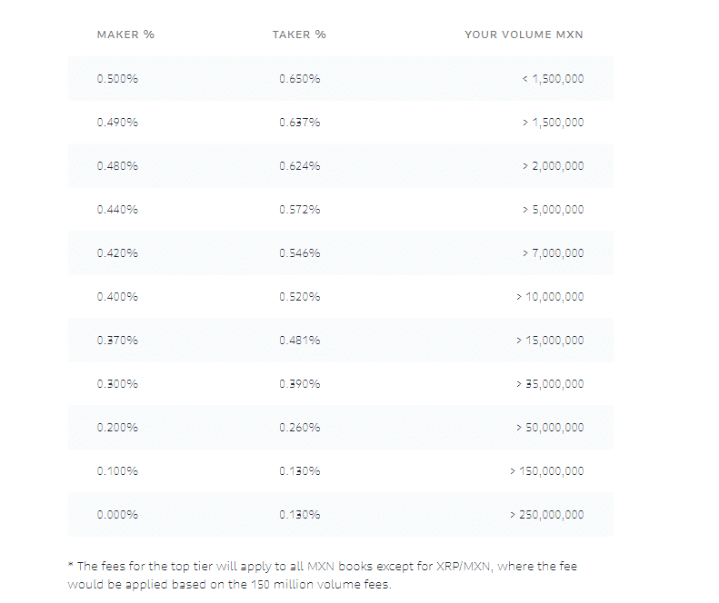 ค่าธรรมเนียมการเทรดจะขึ้นอยู่กับว่า นักเทรดมีการซื้อ-ขายภายในช่วง 30 วันที่ผ่านมามีปริมาณการซื้อ-ขายเป็นเท่าไหร่ ซึ่งจะอ้างอิงจากตารางของ Maker-Taker ในแต่ละสกุลเงิน Fiat และสกุลเงินดิจิทัล โดยขอยกตัวอย่างรูปภาพของค่าธรรมเนียมการเทรดมาดัง 2 รูปภาพด้านล่างนี้
